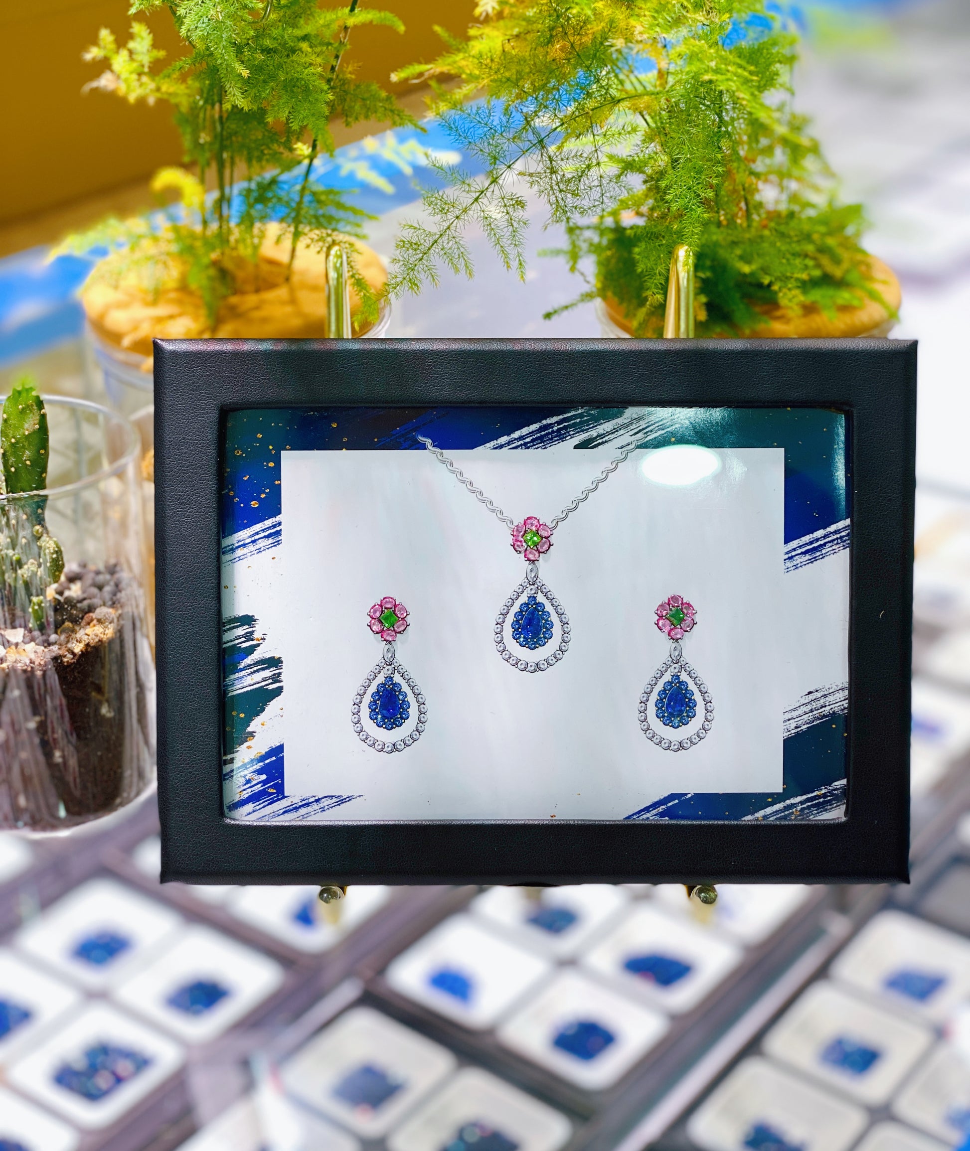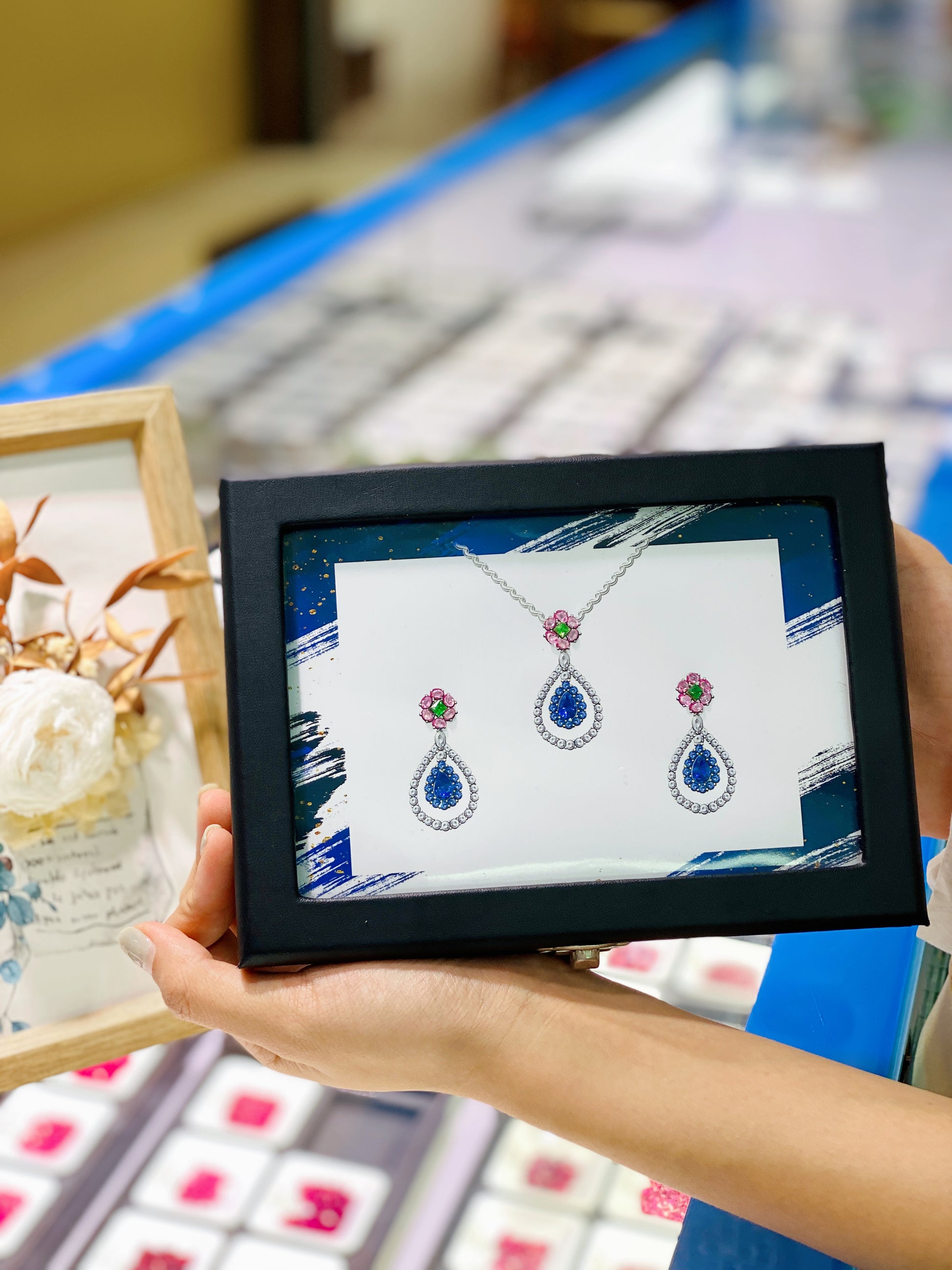 Matching box "Blue and Green Between Flowers" 1.529ct oval blue pendant, bright gemstone color, exquisite design, fresh