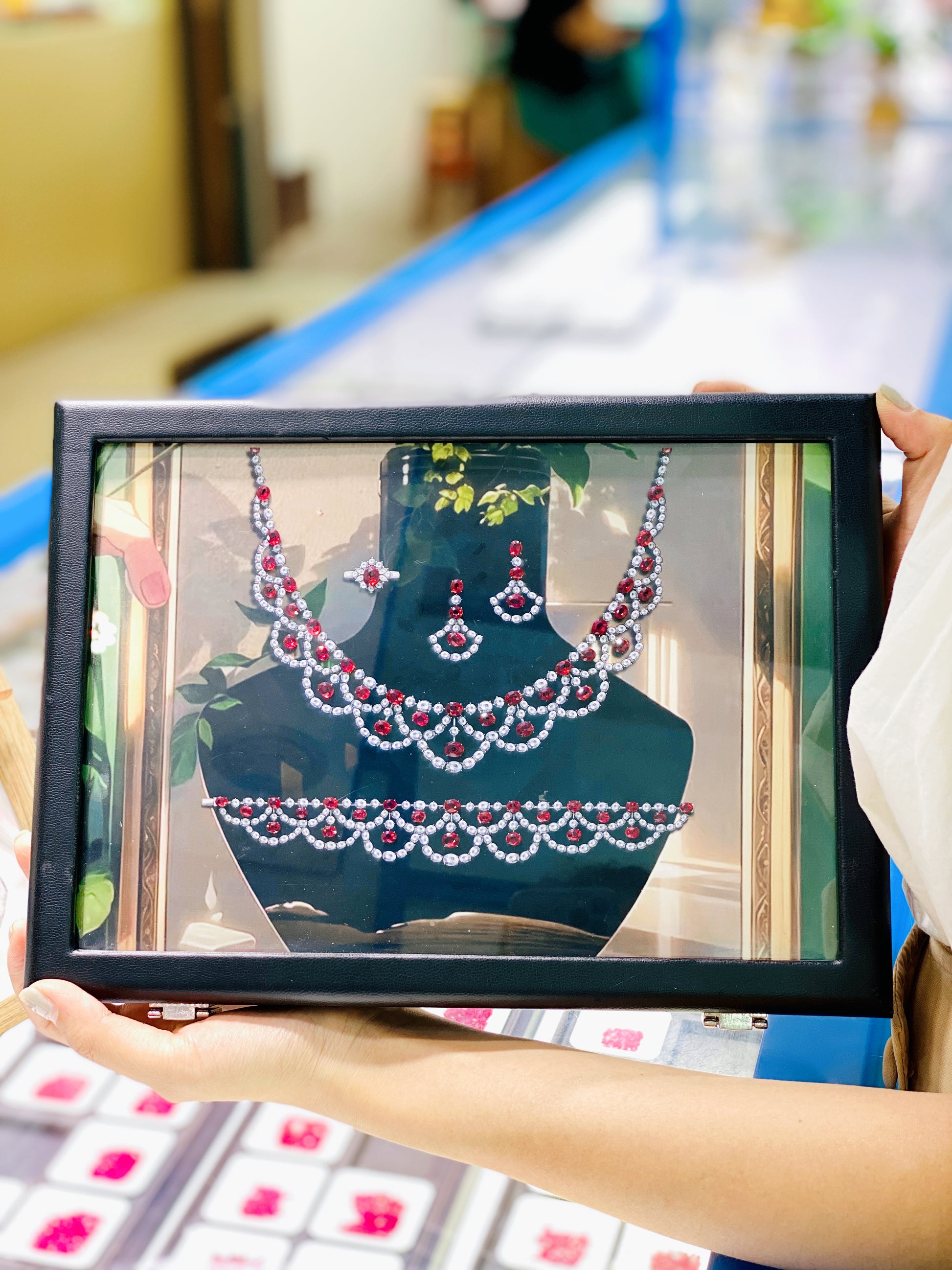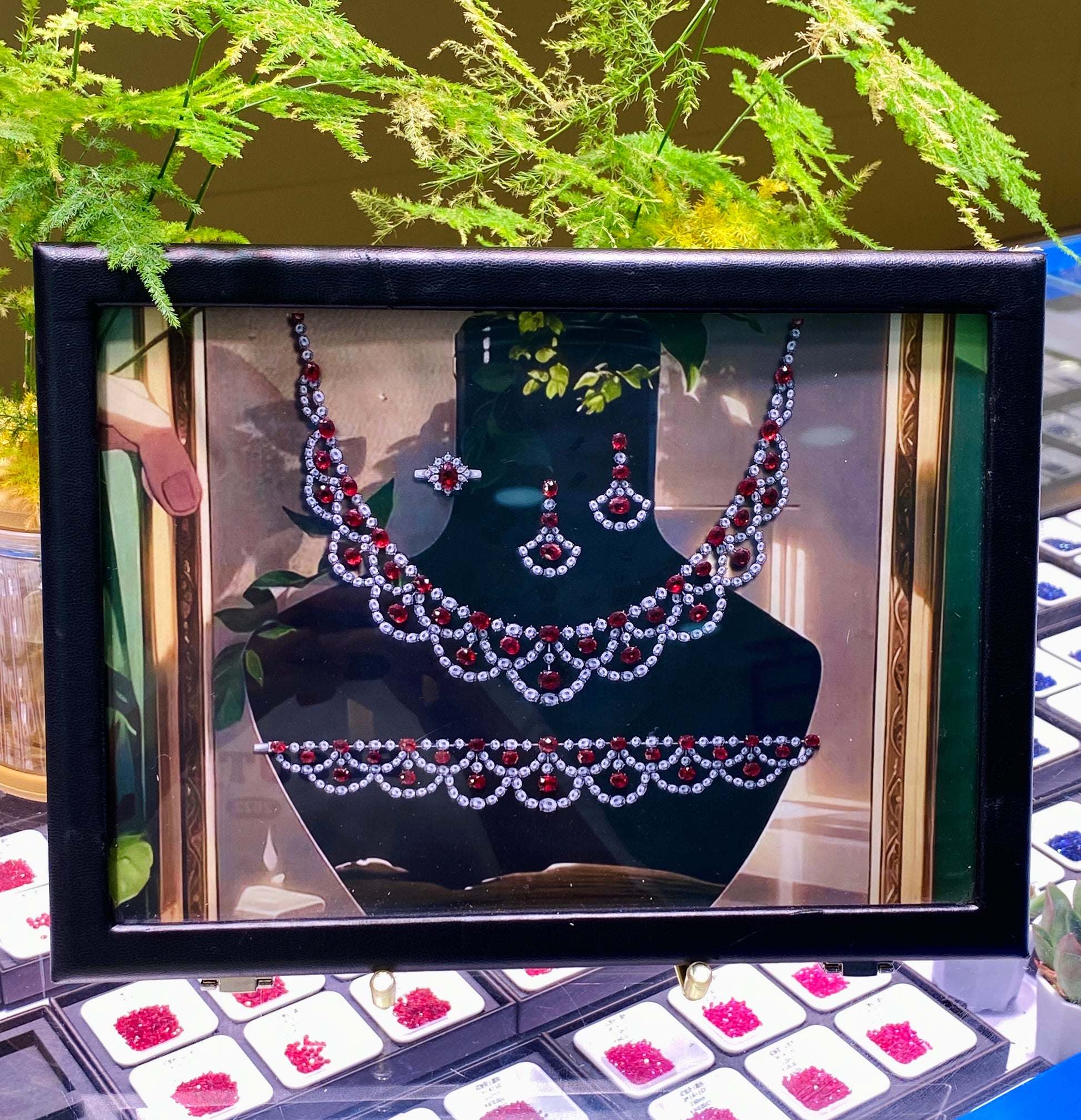 C25 Matching Box "Manzushahua" 27.175ct Pigeon Blood Red Ruby Bracelet, Necklace, Earrings, Ring, Set of Four Unset Stones with Rich Color and Full Fire Color Cutting