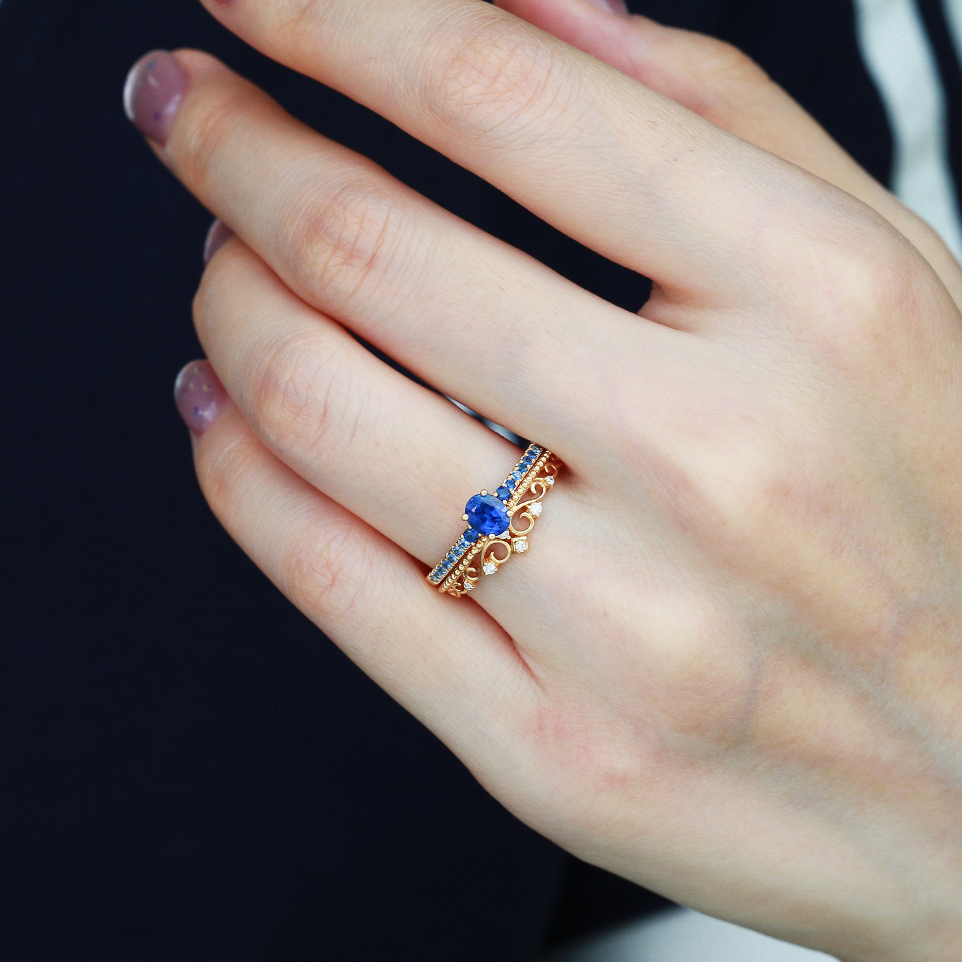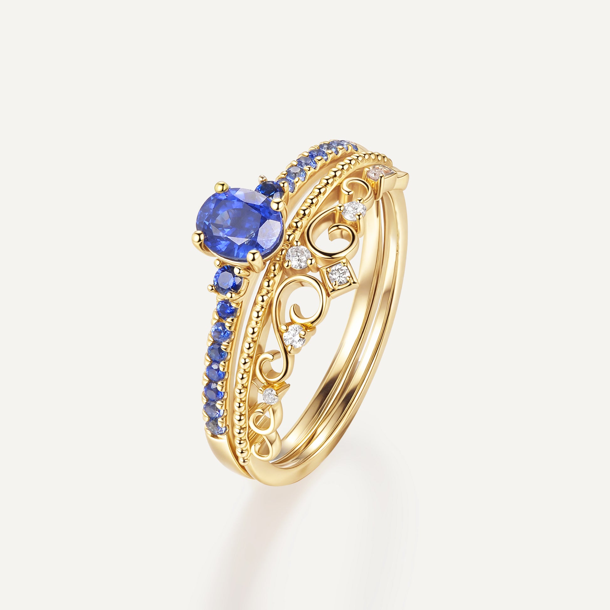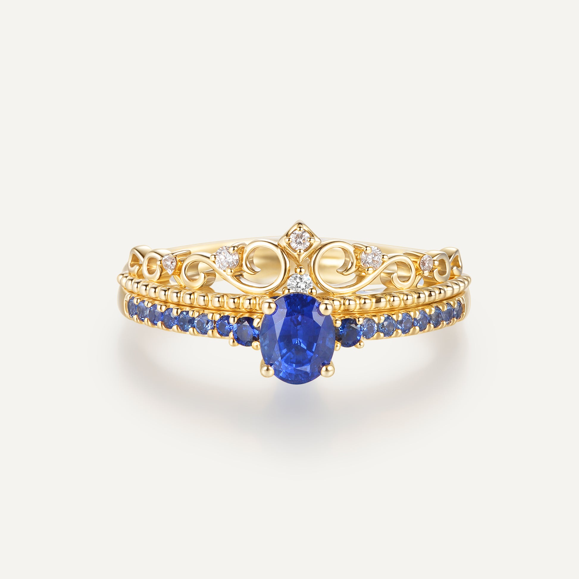 Sapphire Ring: A double-tiered crown motif cradling a deep sapphire, where gold warmth meets sapphire mystery—like wearing starlight on your finger.