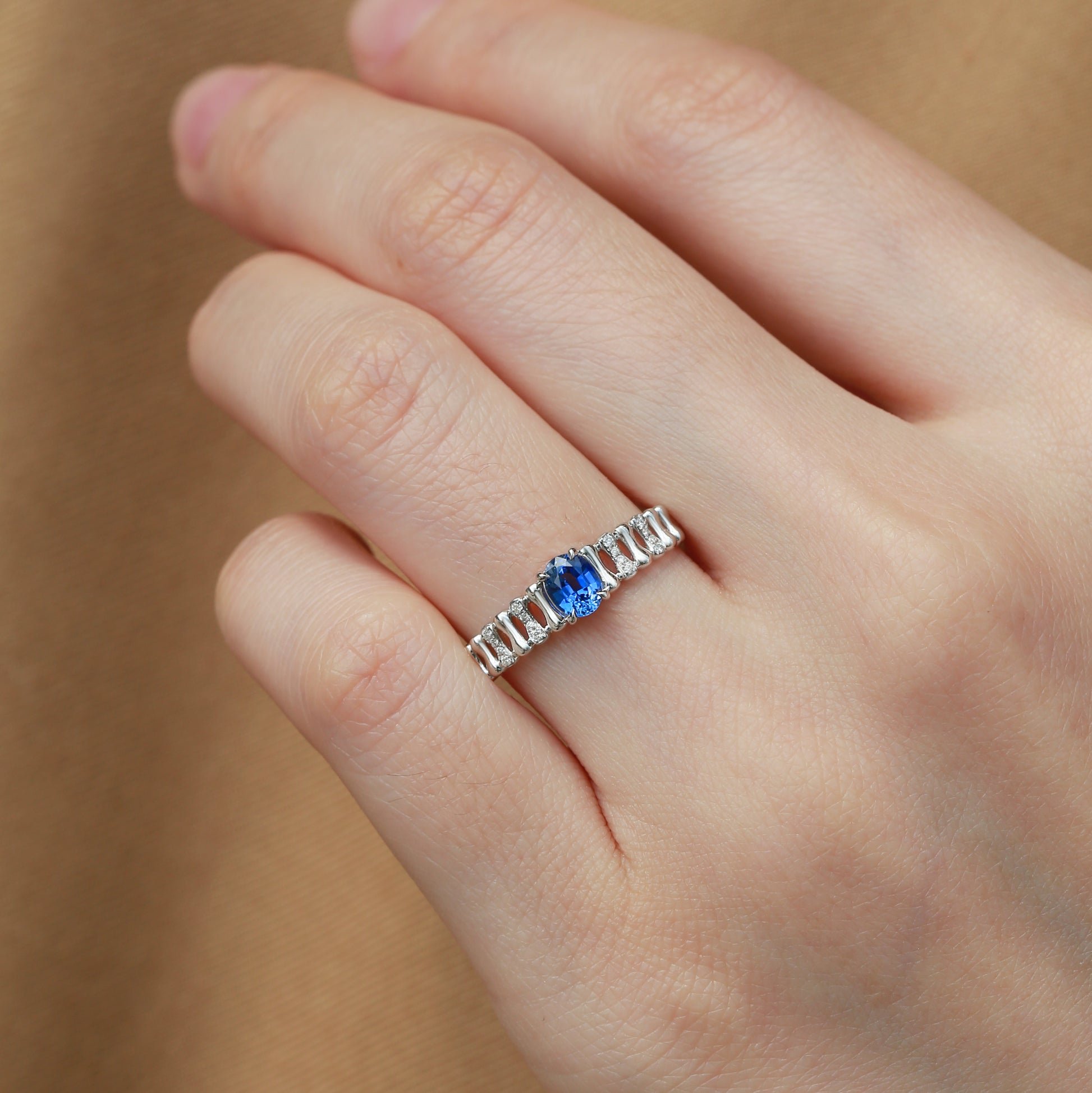 💕An oval blue sapphire, deep as a secret, anchored by alternating yellow/white gold bands. Diamonds dot the metal like whispered promises, balancing warmth and coolness in one perfect line.