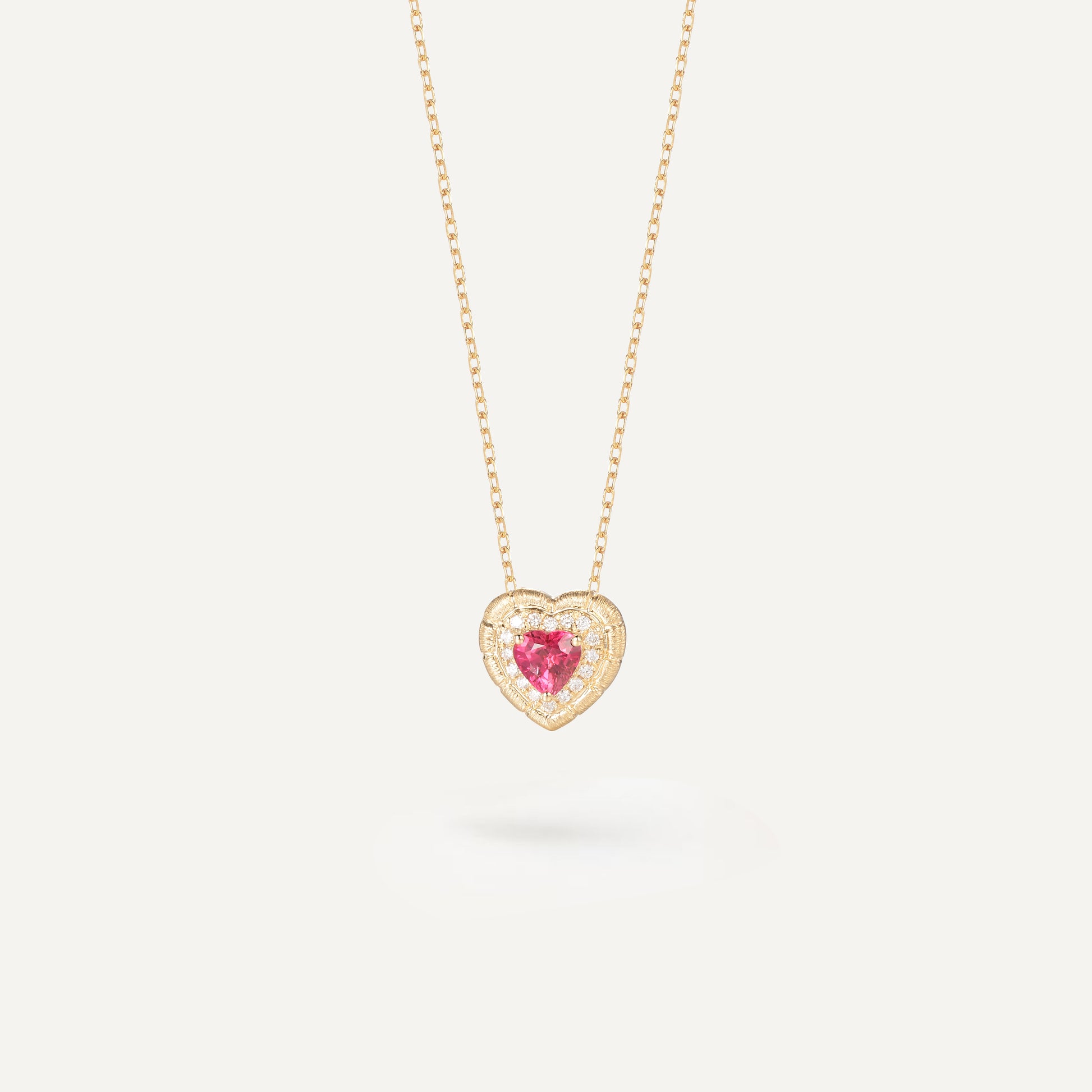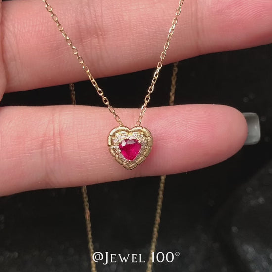 🔒This heart - shaped pendant features a 4mm ruby at its center, surrounded by a delicate frame of brushed gold that enhances texture and depth. The subtle matte finish contrasts with sparkling diamonds, symbolizing enduring love with artisanal craftsmanship. Lightweight yet luxurious, it’s designed to be cherished daily.