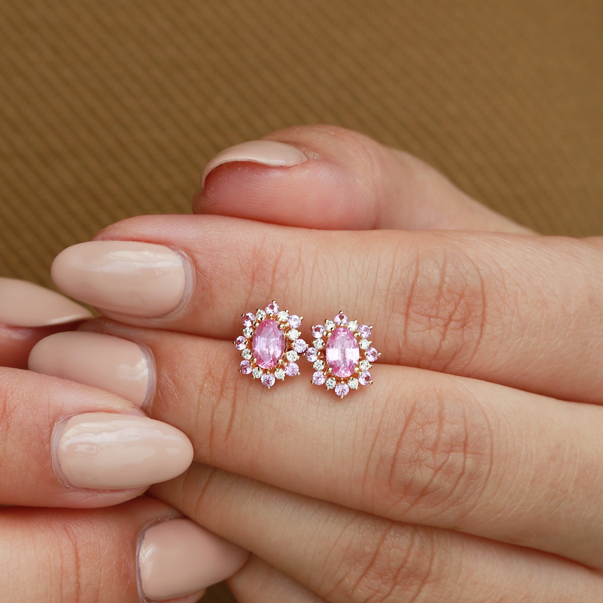 Earrings in 18K gold with oval-cut center stone pink sapphire 1.101ct ,accent stone round cut pink sapphires totalling 0.403ct,brilliant-cut diamonds totalling 0.16ct, Total weight: 2.02g.