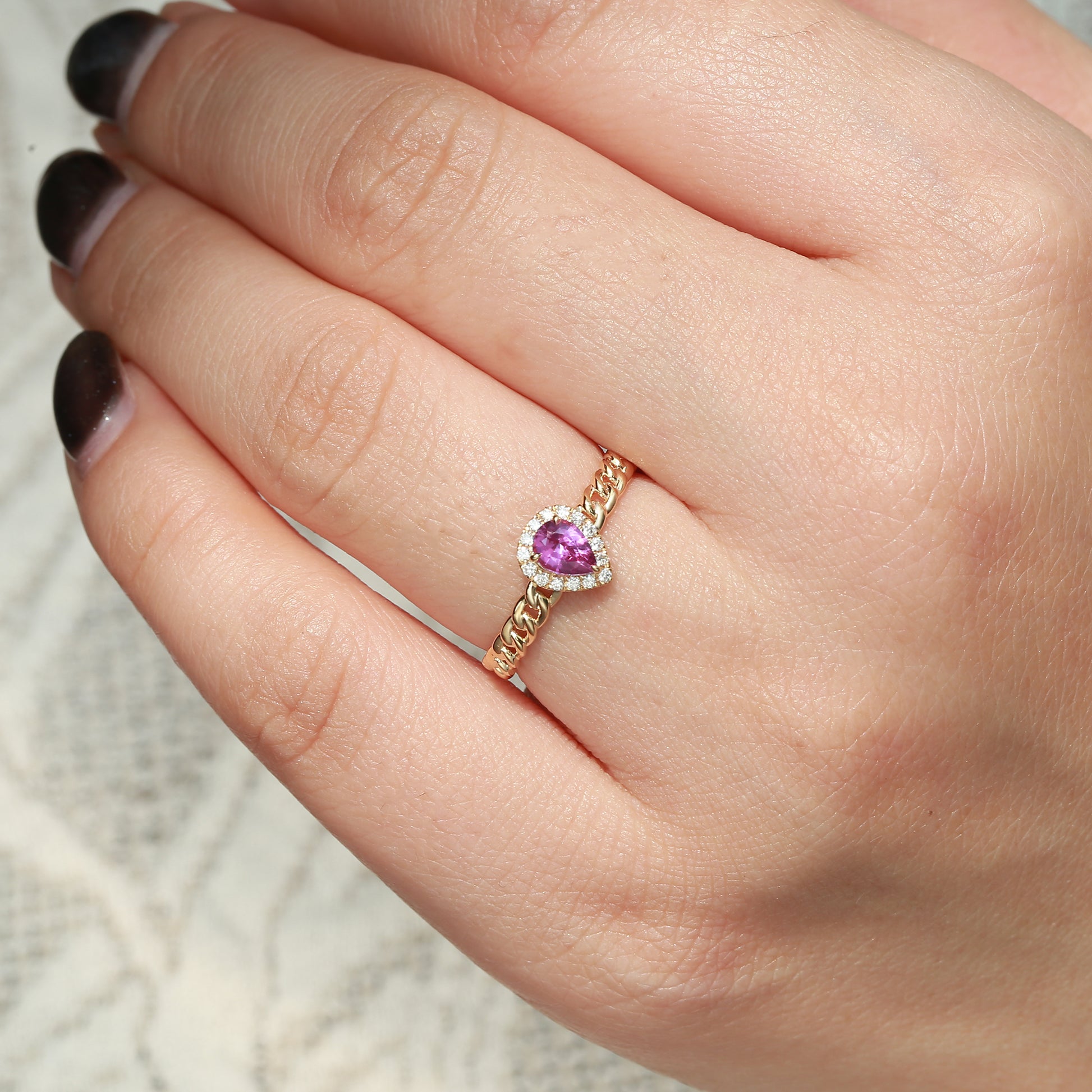 🌸"Where streetwear meets sophistication – A teardrop pink sapphire cradled in Cuban links, embodying rebellious elegance."