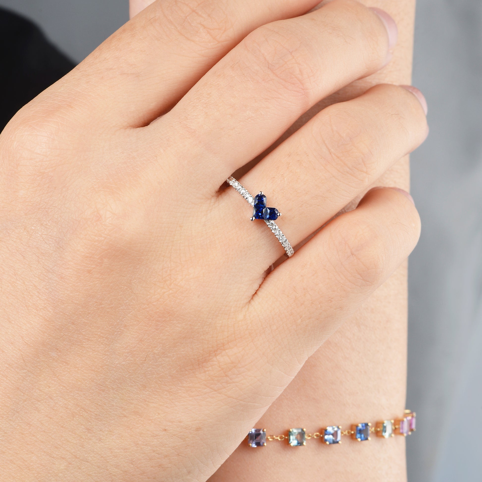 💙"Artfully arranged in a symmetrical trio, three precision-cut princess sapphires form an eternal heart-shaped knot, cradled in gold to symbolize steadfast love through every facet."